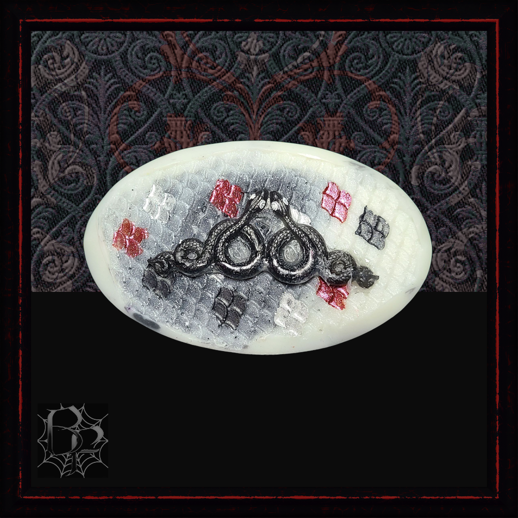 Save Your Serpent bars are carefully designed to be luxurious and buttery. Each bar is hand-poured to create the pearl white and charcoal grey base. They feature an undulating snakeskin textured surface in a hand-painted pattern of desert red, pearl, and charcoal black, with a snake raised detail on top. Because each bar is hand-painted the result is a unique pattern that makes each product unique. The snake detail itself may be either red, black or grey.