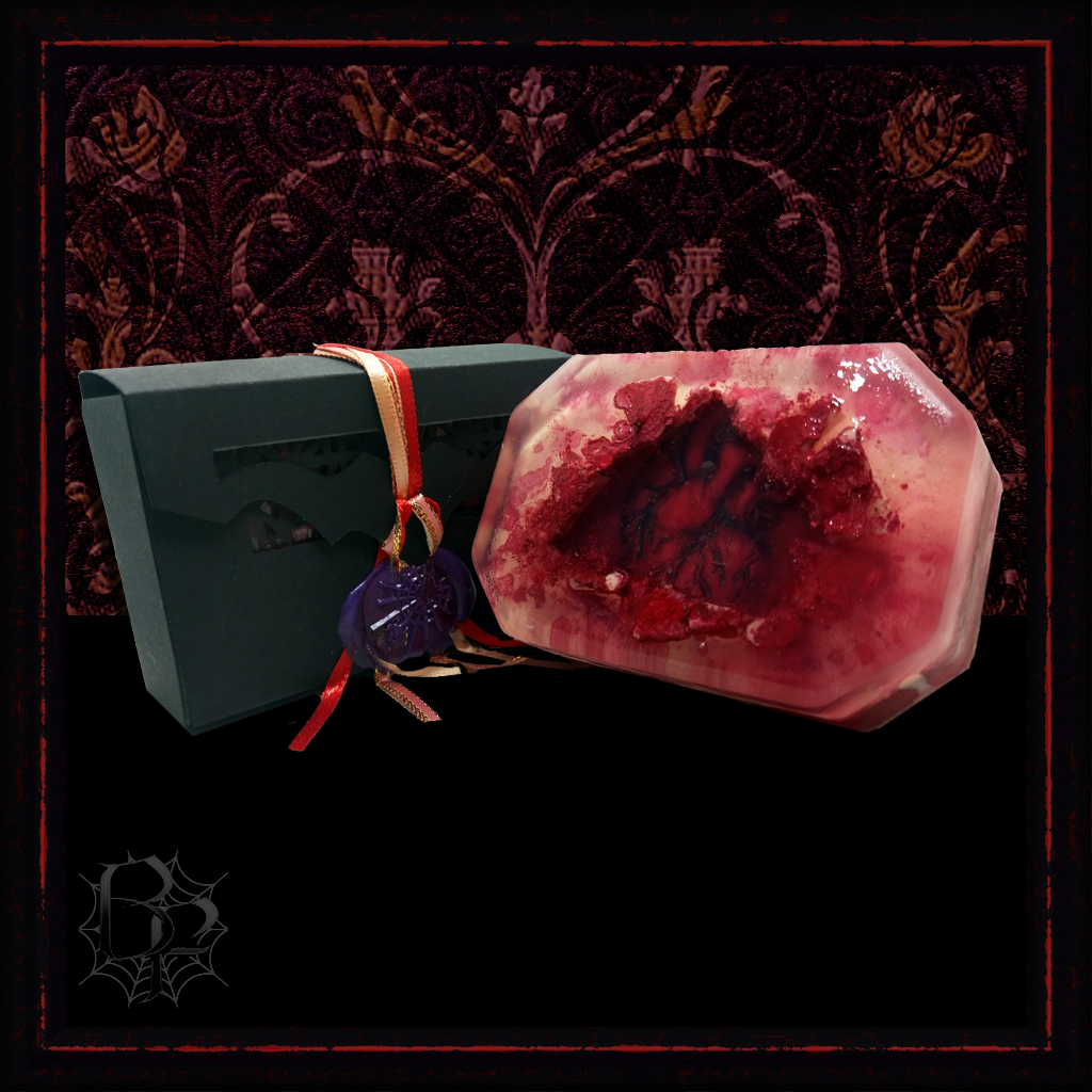 Horrorgoths rejoice because Under Your Skin soap were designed for your very specific sensibilities. The graphic design is that of an exposed anatomical human heart beating under a ripped open "skin" layer. Both layers are hand-painted, and because mortals and vampires alike come in many colors, there are four options to choose from (vampire, light, medium and dark). All versions feature the same scent profile.